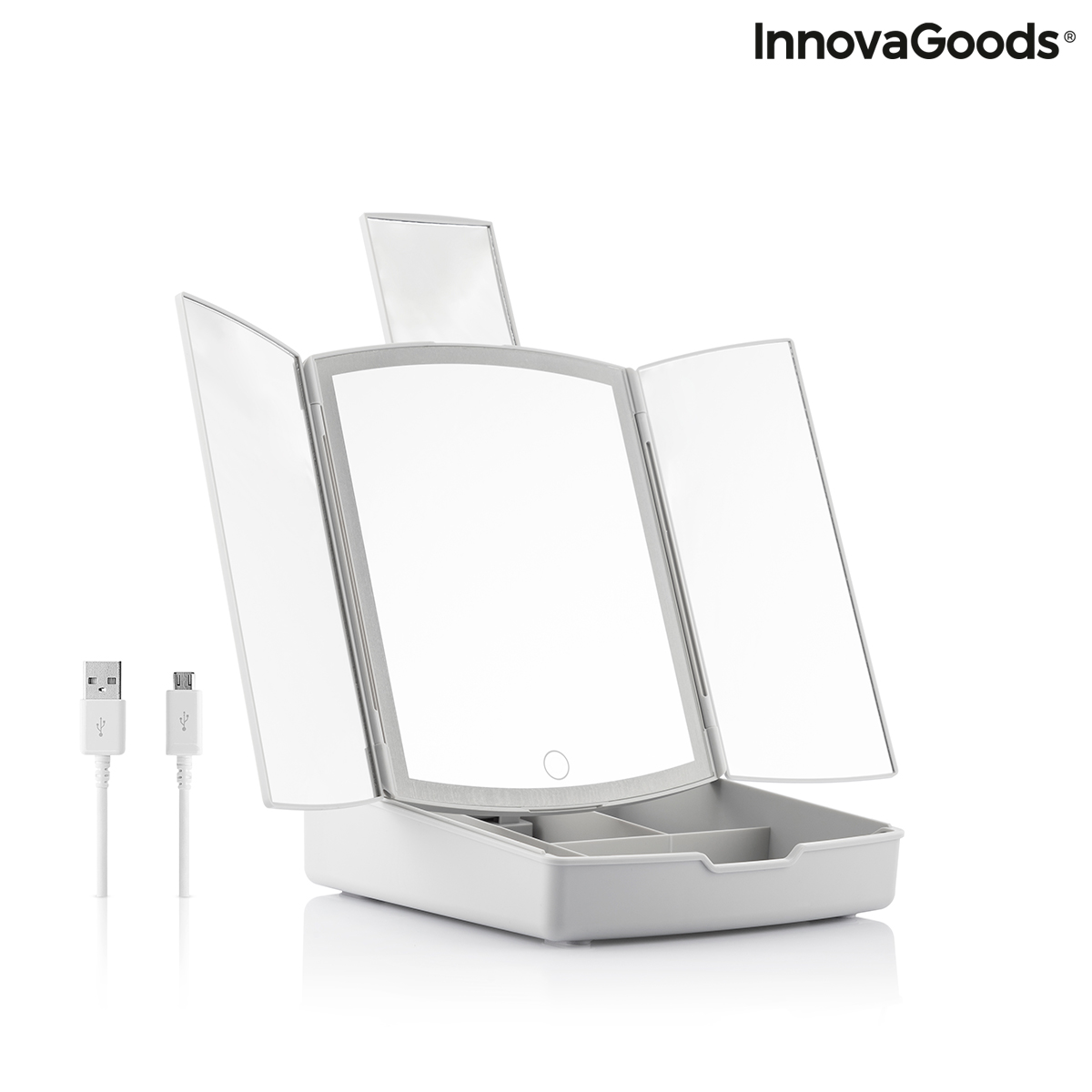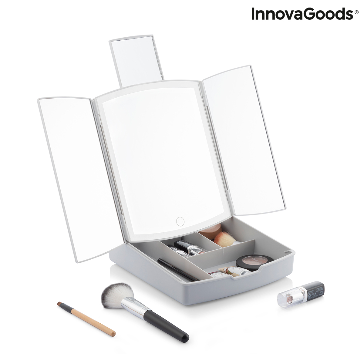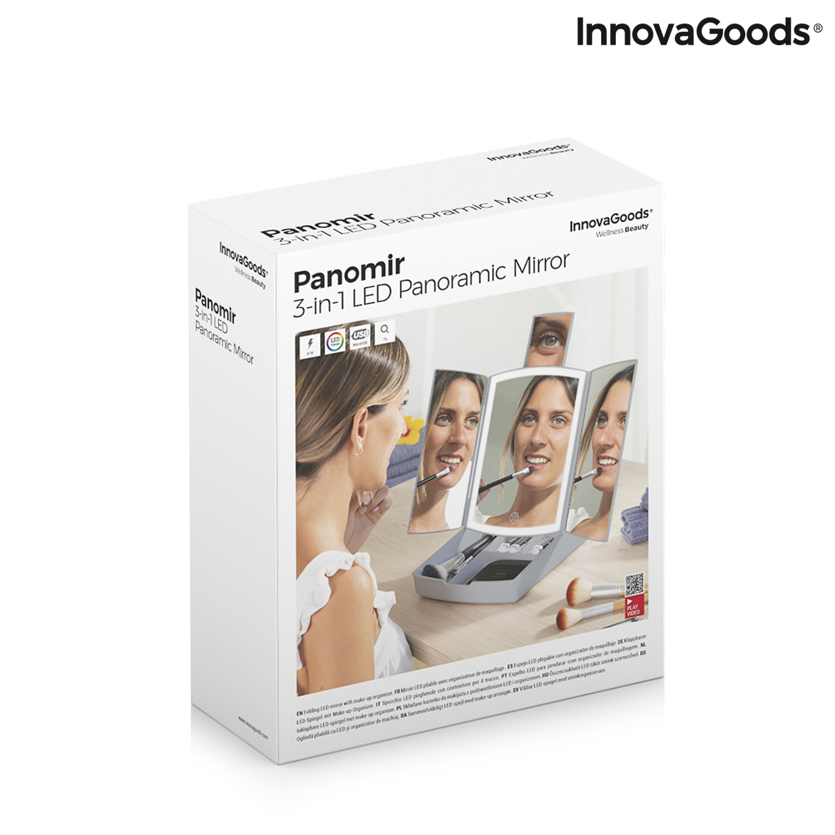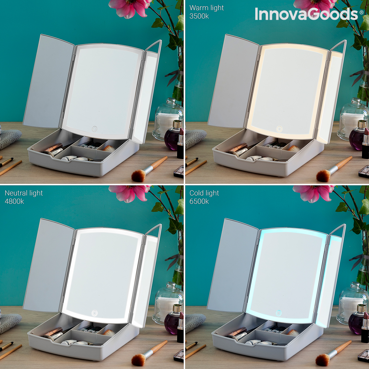 Originalno zložljivo LED ogledalo z organizatorjem ličil (3 v 1 večnamensko), idealno za udobno ličenje z optimalnim vidom. Zaradi svoje moderne, zložljive zasnove in z več predali za shranjevanje pripomočkov in izdelkov za ličenje vam omogoča prihranek prostora in poskrbi, da boste imeli vse kar potrebujete za enostaven nanos ličil vedno pri roki. Poleg tega je zelo vsestransko in prilagodljivo, saj deluje preko USB kabla (vključuje kabel USB na mikro USB) ali na baterije (niso priložene). Ima LED lučko z upravljanjem na dotik in 3 načine osvetlitve (hladna svetloba, topla svetloba, dnevna svetloba). To panoramsko in prenosno namizno ogledalo ima sredinsko in dve stranski ogledali, ki se zlahka zložita in odpreta. Vključuje tudi mini drsno ogledalo na zadnji strani s povečavo x7 za povečan pogled na želeni predel obraza. Ima majhne nedrseče noge za trden oprijem.