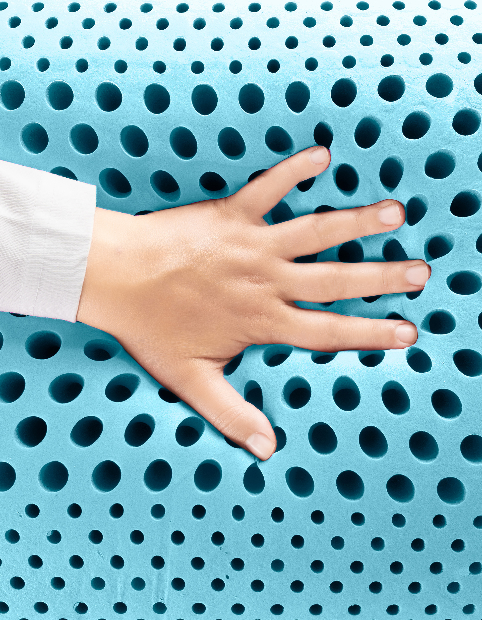 Čudovito čvrst vzglavnik klasične oblike Air Therapy je narejen iz 100% spominske pene, perforacije oz. luknjice na površini pa so različne široke in različno razporejene po vzglavniku: